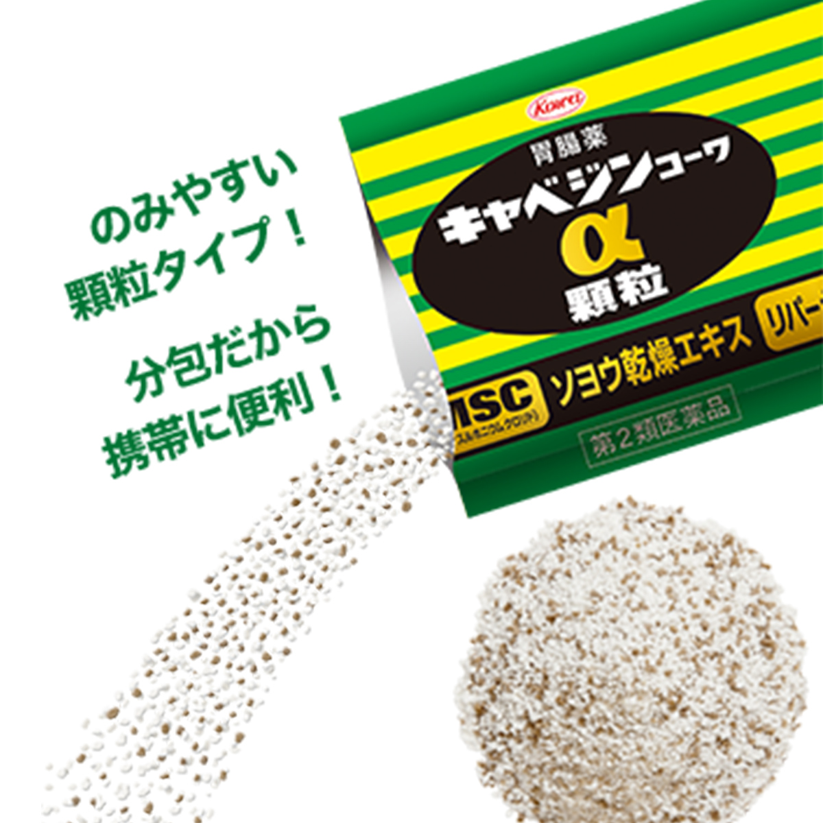 キャベジンコーワα顆粒は,荒れて傷んだ胃の粘膜を修復し,正常な状態に整えるキャベジン本来の効きめに加え,胃の運動を促進する生薬成分ソヨウなどにより,弱った胃の働きを取り戻していく胃腸薬です。