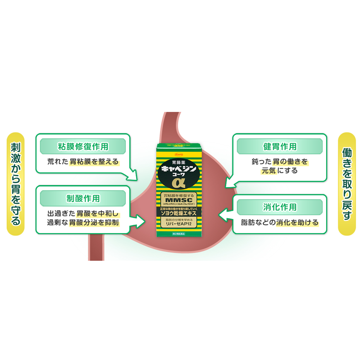 キャベジンコーワαは荒れて傷んだ胃の粘膜を修復し、正常な状態に整える有効成分MMSCに加え、胃の動きを高めるソヨウが協力して働くことで、弱ってきた胃を元気にし、正常な働きを取り戻していく胃腸薬です。