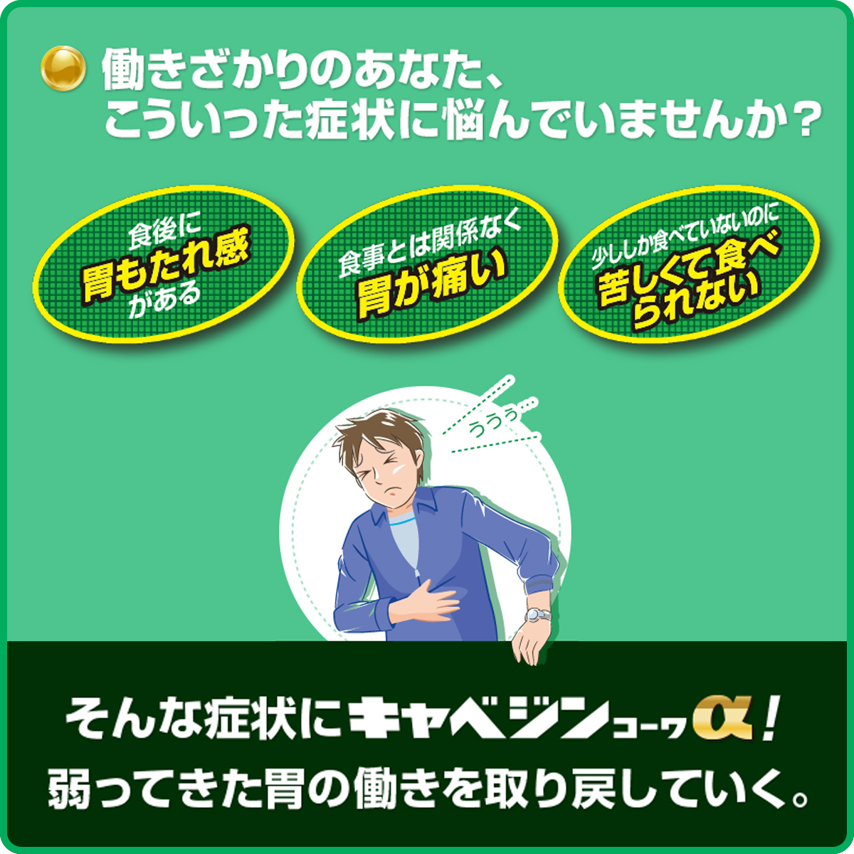 胃は,もたれや胃重,胃痛など,いろいろなサインで不調を知らせてきます。このような症状は,脂肪分の多い食事や食べ過ぎ・飲み過ぎなどといった過度の物理的負担や,ストレスに伴う精神的負担,加齢による機能低下など,様々な要因によって胃が弱っていくことで起こります。 キャベジンコーワα顆粒は,荒れて傷んだ胃の粘膜を修復し,正常な状態に整えるキャベジン本来の効きめに加え,胃の運動を促進する生薬成分ソヨウなどにより,弱った胃の働きを取り戻していく胃腸薬です。 毎食後1日3回の服用で胃が元気に働くようになり,胃の不快な症状にすぐれた効果をあらわします。 のみやすい顆粒で,携帯にも便利な分包タイプの胃腸薬です。
