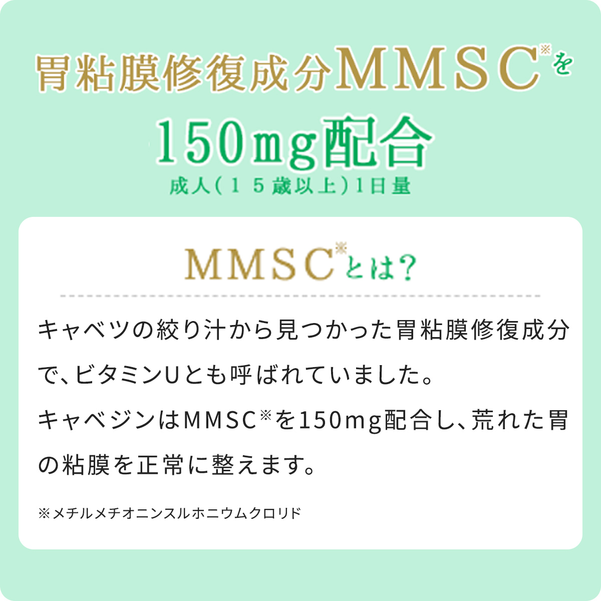 キャベツの絞り汁から見つかった胃粘膜修復成分で、ビタミンUとも呼ばれていました。 キャベジンはMMSC※を150mg配合し、荒れた胃の粘膜を正常に整えます。 ※メチルメチオニンスルホニウムクロリド