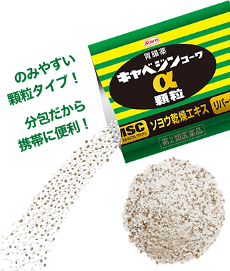 キャベジンコーワα顆粒は,荒れて傷んだ胃の粘膜を修復し,正常な状態に整えるキャベジン本来の効きめに加え,胃の運動を促進する生薬成分ソヨウなどにより,弱った胃の働きを取り戻していく胃腸薬です。