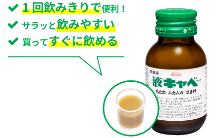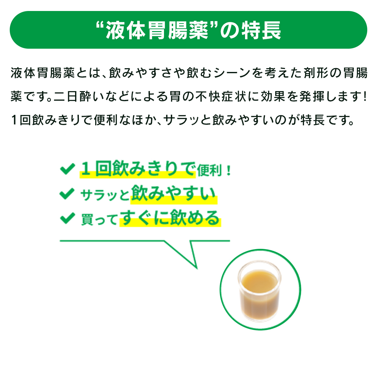 液体胃腸薬とは、飲みやすさや飲むシーンを考えた剤形の胃腸薬です。二日酔いなどによる胃の不快症状に効果を発揮します!1回飲みきりで便利なほか、サラッと飲みやすいのが特長です。