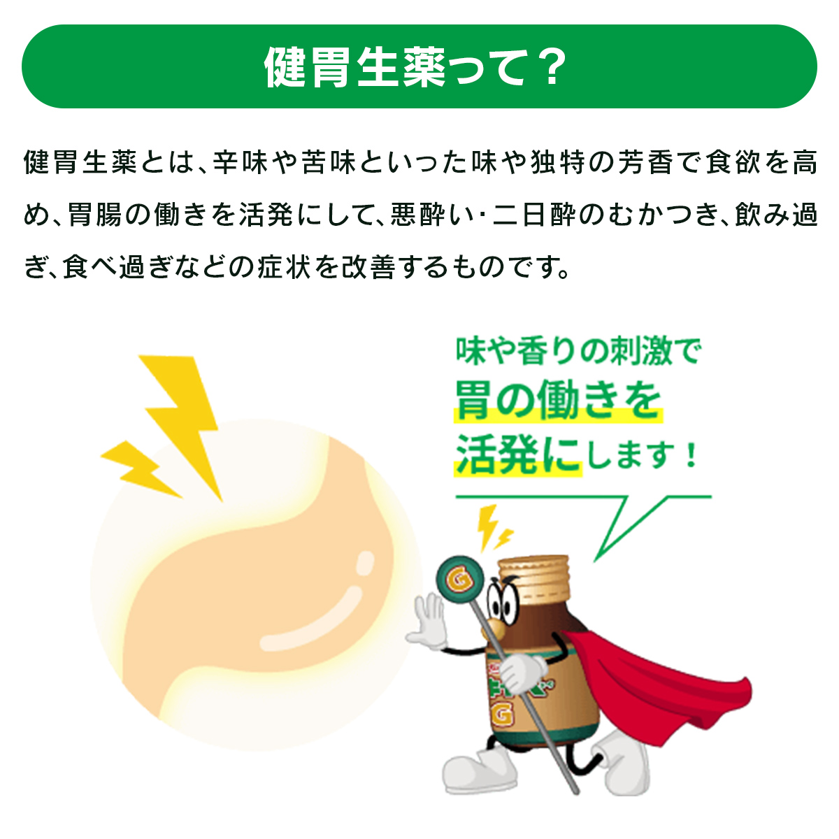 健胃生薬とは、辛味や苦味といった味や独特の芳香で食欲を高め、胃腸の働きを活発にして、悪酔い・二日酔のむかつき、飲み過ぎ、食べ過ぎなどの症状を改善するものです。