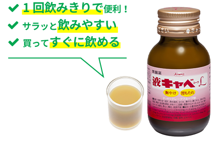 液体胃腸薬とは、飲みやすさや飲むシーンを考えた剤形の胃腸薬です。二日酔いなどによる胃の不快症状に効果を発揮します!1回飲みきりで便利なほか、サラッと飲みやすいのが特長です。