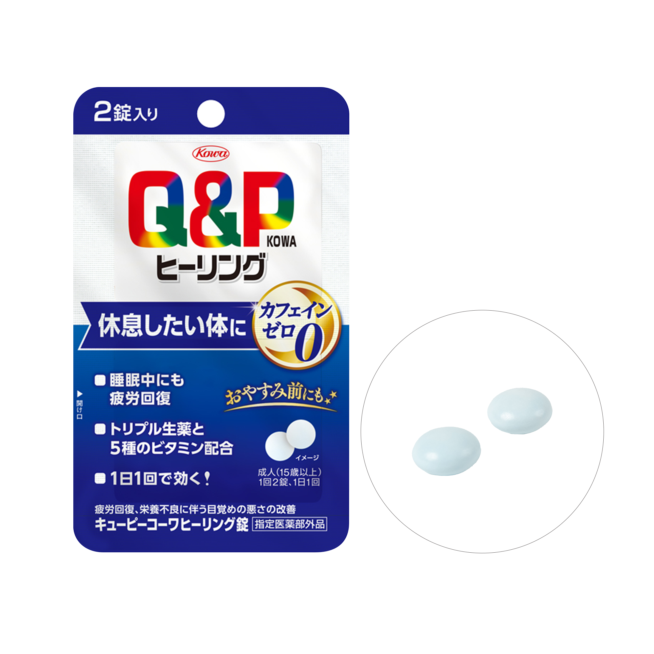カフェインゼロでおやすみ前にもおすすめキューピーコーワヒーリング錠は、おやすみ前に服用して疲労回復したい方のために、カフェインゼロ。