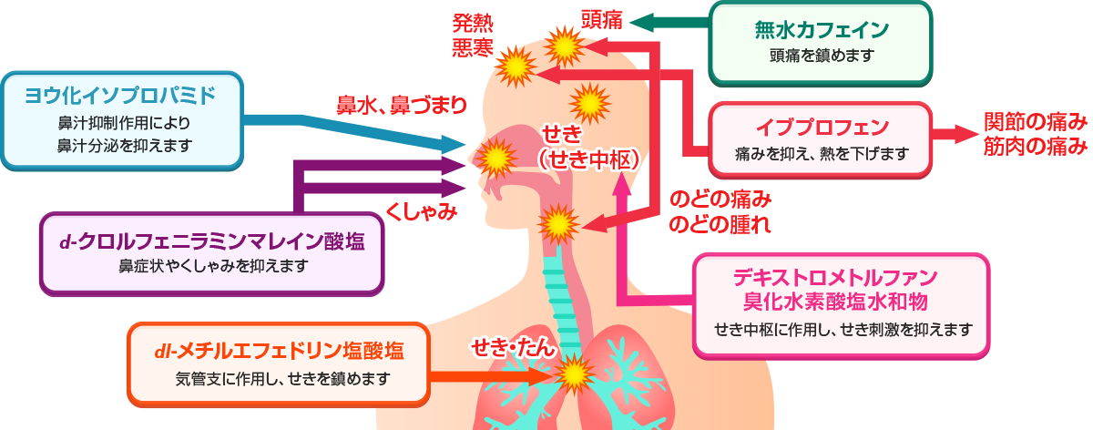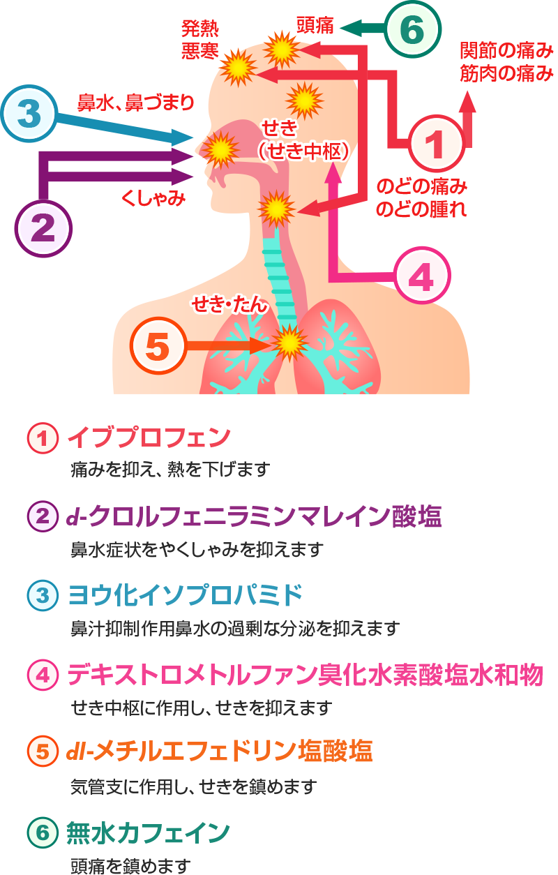 かぜの諸症状(のどの痛み,発熱,鼻水,鼻づまり,くしゃみ,せき,たん,悪寒,頭痛,関節の痛み,筋肉の痛み)の緩和