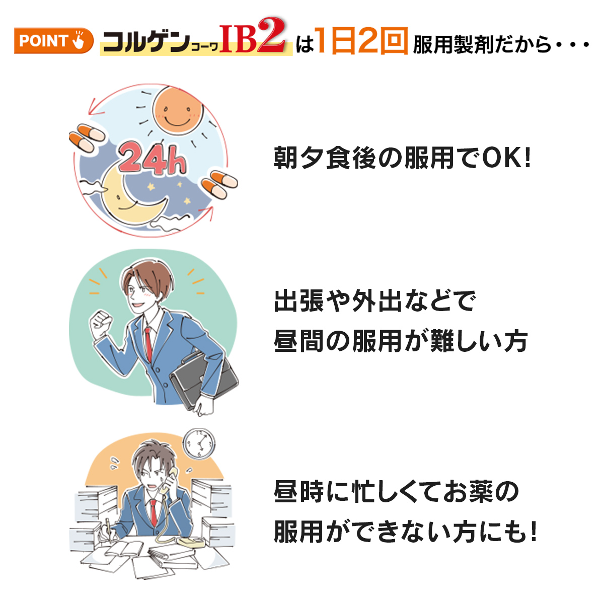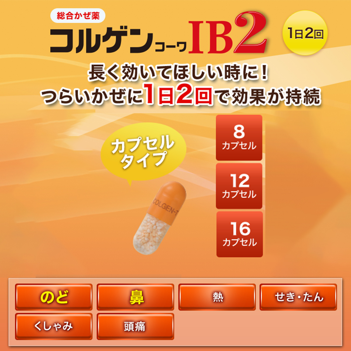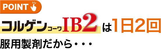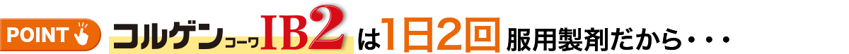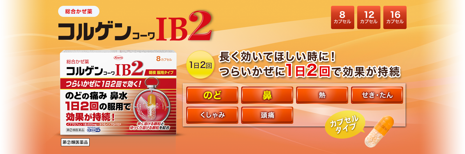 コルゲンコーワIB2は、有効成分の溶け出し方をコントロールした製剤です。 カプセルの中は、溶け方が違う2種類の顆粒剤の組み合わせになっていて、服用するとまず先にオレンジ色の顆粒が溶けて効きめをあらわし、ゆっくり溶ける白色の顆粒が後から効きめをあらわしますので、1日2回の服用で長く効果が続きます。