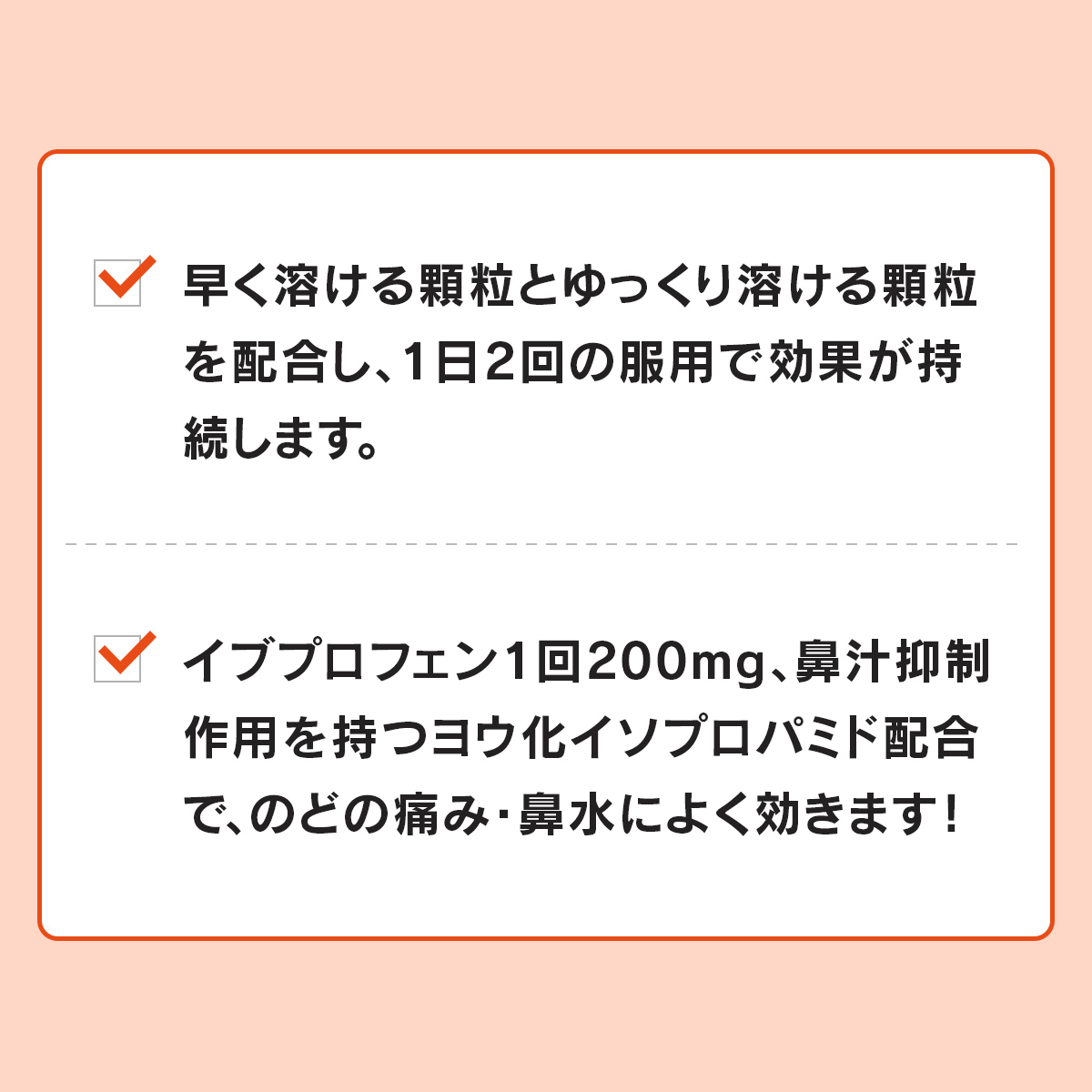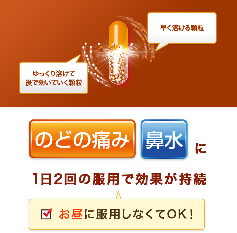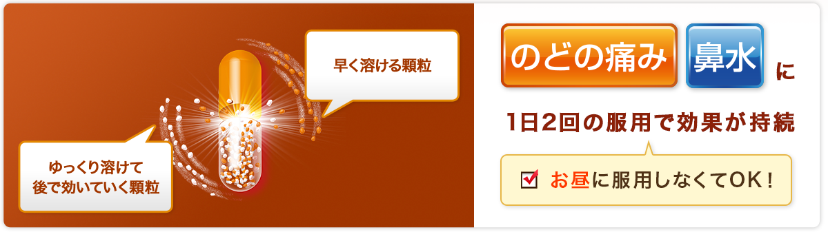 本剤は,有効成分の溶け出し方をコントロールした製剤です。カプセルの中は溶け方が違う2種類の顆粒剤の組み合わせになっていて,服用するとまず先にオレンジ色の顆粒が溶けて効きめをあらわし,ゆっくり溶ける白色の顆粒があとから効きめをあらわします。また,1日2回の服用で効きめをあらわすよう,炎症に対してすぐれた効きめを持つイブプロフェンや鼻汁抑制作用を持つヨウ化イソプロパミドなど,かぜに効く6つの成分を効果的に処方してあります。