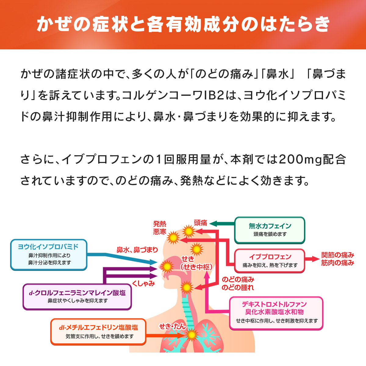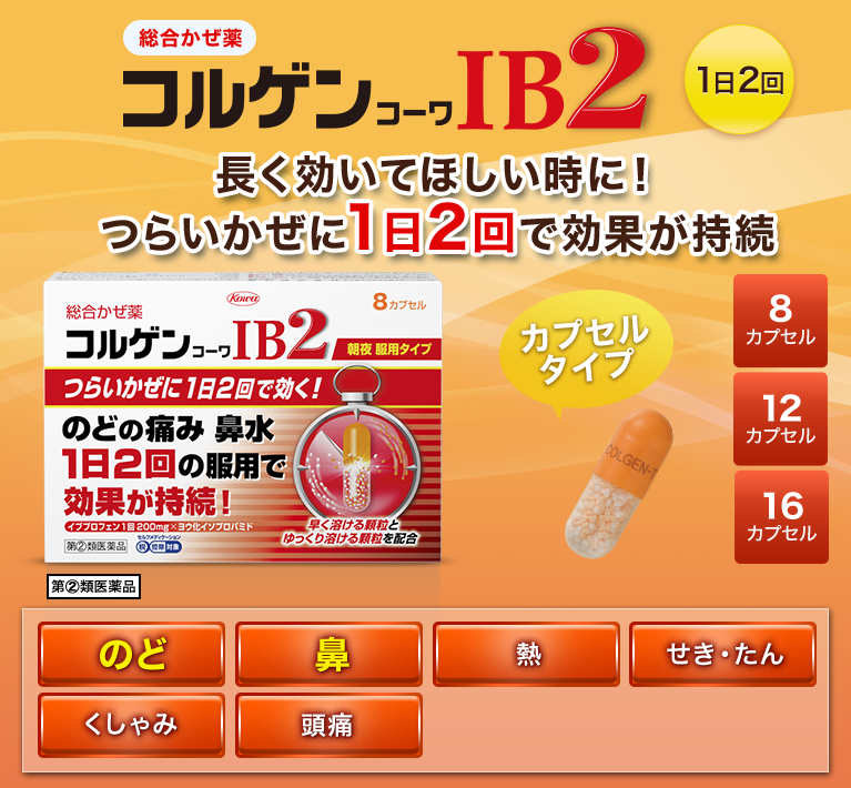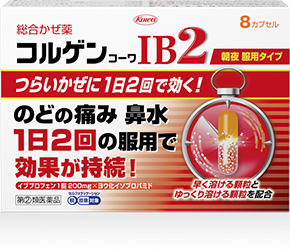 かぜの諸症状の中で、多くの人が「のどの痛み」「鼻水」 「鼻づまり」を訴えています。コルゲンコーワIB2は、ヨウ化イソプロパミドの鼻汁抑制作用により、鼻水・鼻づまりを効果的に抑えます。 さらに、イブプロフェンの1回服用量が、本剤では200mg配合されていますので、のどの痛み、発熱などによく効きます。