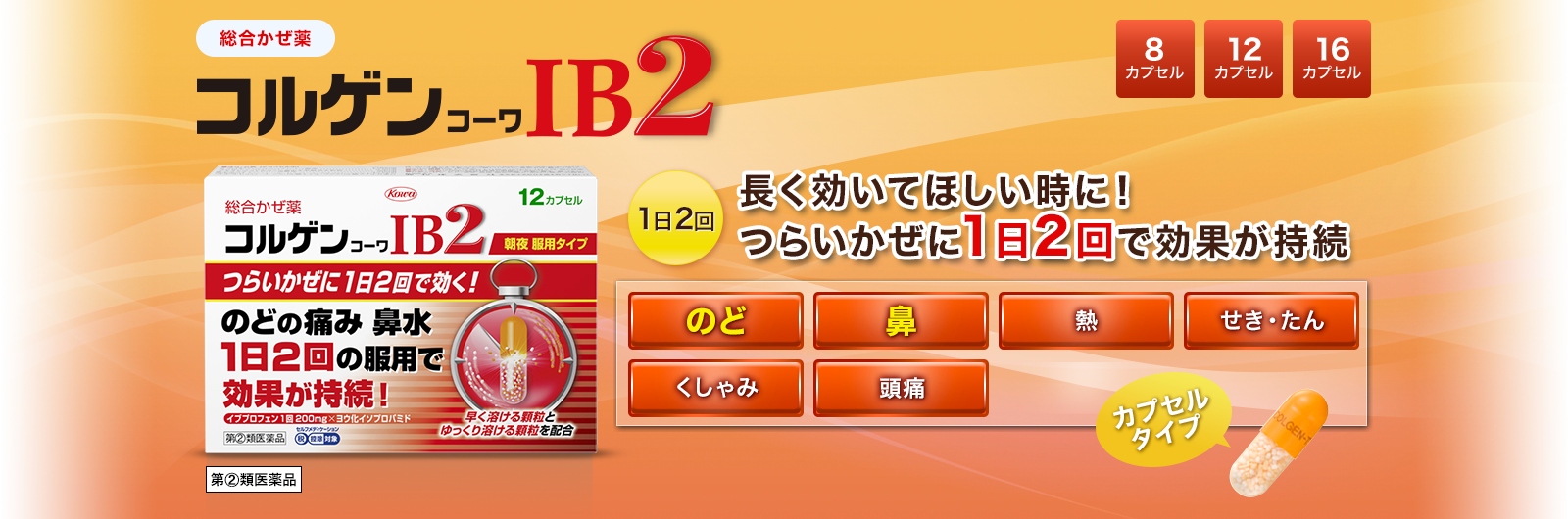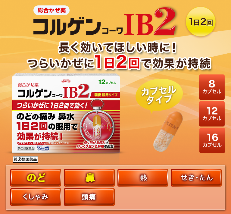 長く効いてほしい時に!つらいかぜに1日2回で効果が持続 コルゲンコーワIB2 長く効いてほしい時に!つらいかぜに1日2回で効果が持続 コルゲンコーワIB2