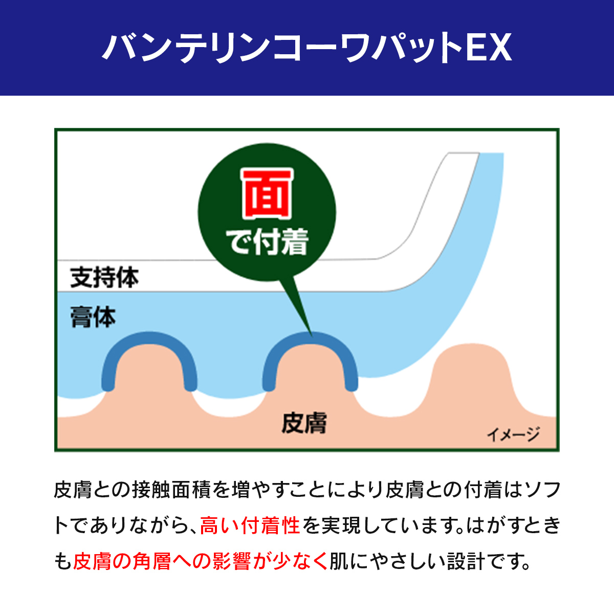 皮膚との接触面積を増やすことにより皮膚との付着はソフトでありながら、高い付着性を実現しています。はがすときも皮膚の角層への影響が少なく肌にやさしい設計です。