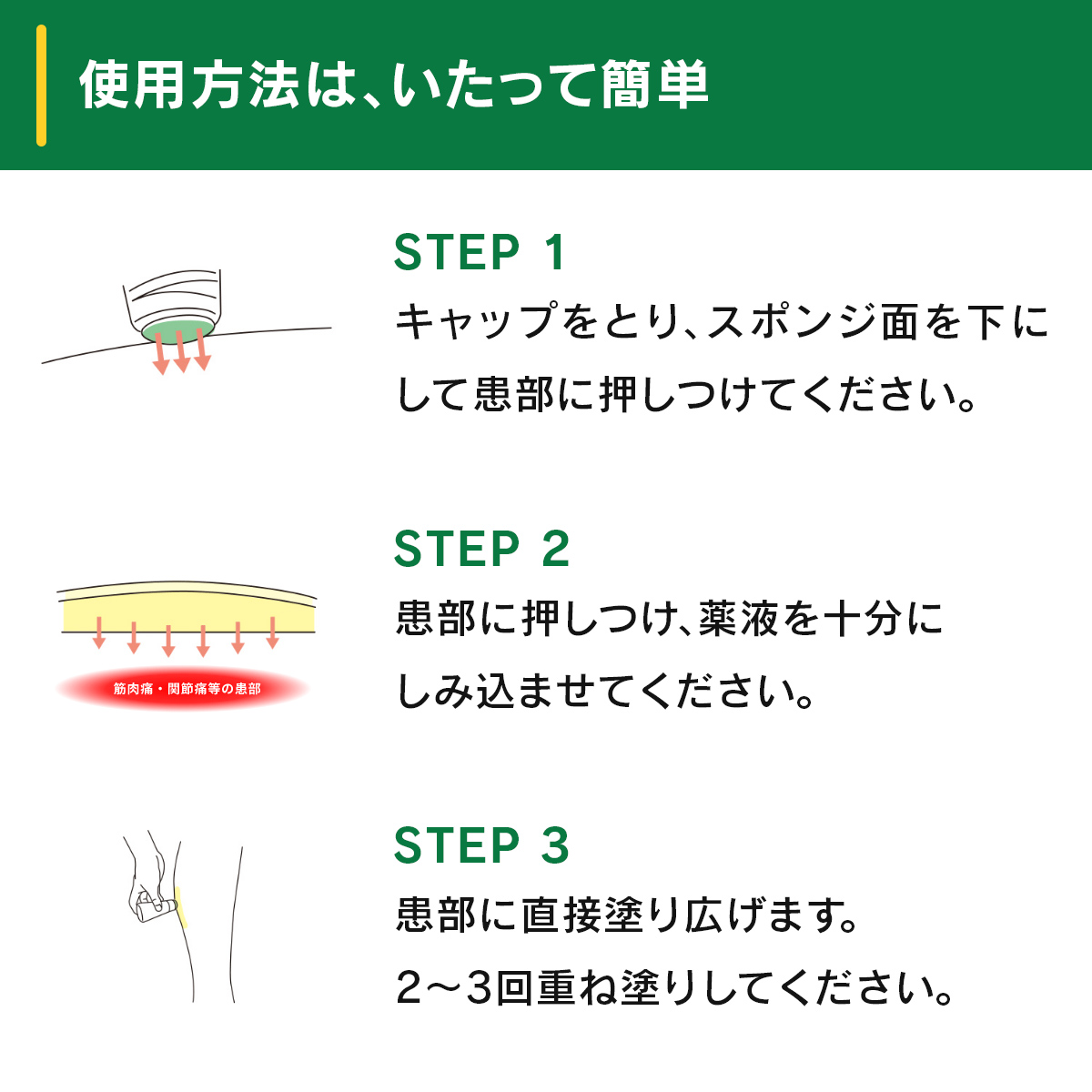 また,痛みの患部に直接塗れるスポンジ容器を採用し,手を汚さずに使えます。