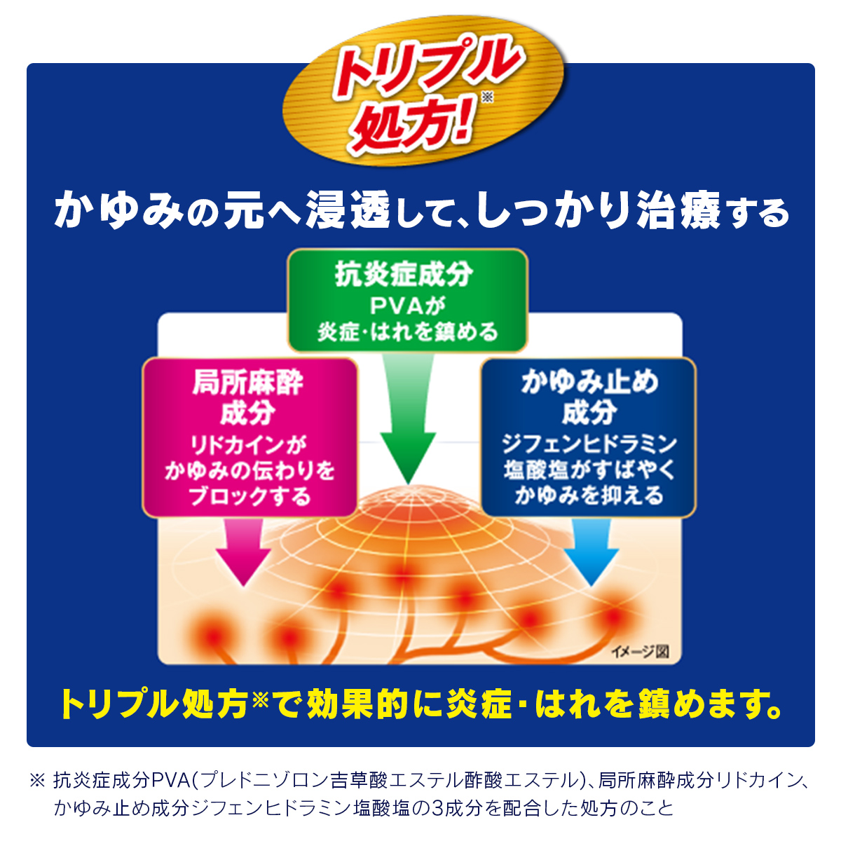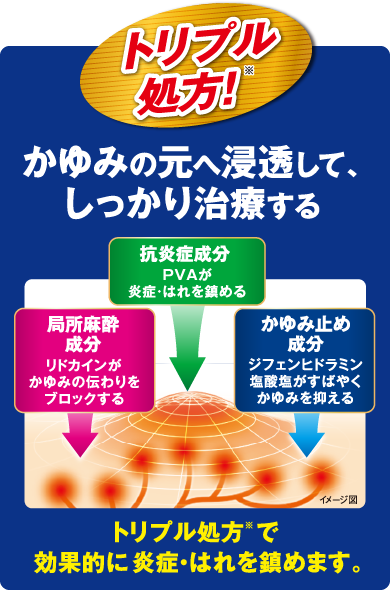 ※抗炎症成分PVA(プレドニゾロン吉草酸エステル酢酸エステル)、局所麻酔成分リドカイン、かゆみ止め成分ジフェンヒドラミン塩酸塩の3成分を配合した処方のこと