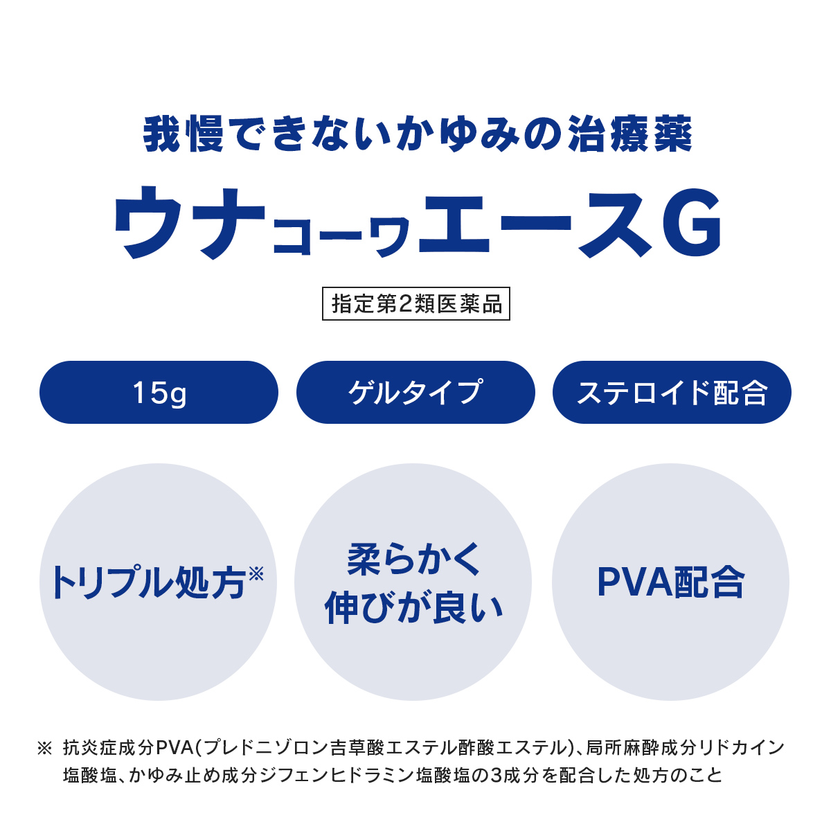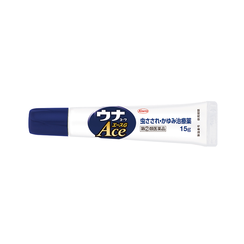 ウナコーワエースGは,このような虫さされ症状にしっかり効くように製剤設計されています。炎症によく効くアンテドラッグ型ステロイド成分(PVA:プレドニゾロン吉草酸エステル酢酸エステル)に,かゆみの伝わりを止めるリドカイン,すばやくかゆみを鎮めるジフェンヒドラミン塩酸塩,患部に清涼感を与える2種の清涼成分が同時配合されています。また,本剤は破れにくいラミネートチューブを採用し,中身の製剤が出しやすく,さらに最後まで使いやすくなっています。