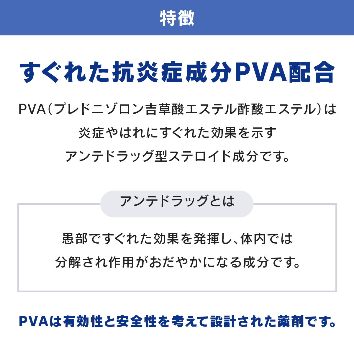 ■すぐれた抗炎症成分PVA配合:PVA(プレドニゾロン吉草酸エステル酢酸エステル)は炎症やはれにすぐれた効果を示すアンテドラッグ型ステロイド成分です。