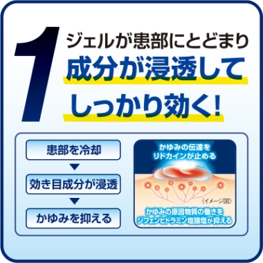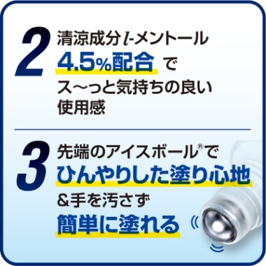 特徴1:ジェルが患部にとどまり、成分が浸透してしっかり効く 特徴2:清涼成分l-メントール4.5%配合でスーっと気持ちの良い使用感 特徴3:先端のアイスボール®でひんやりした塗り心地、手を汚さず簡単に塗れる