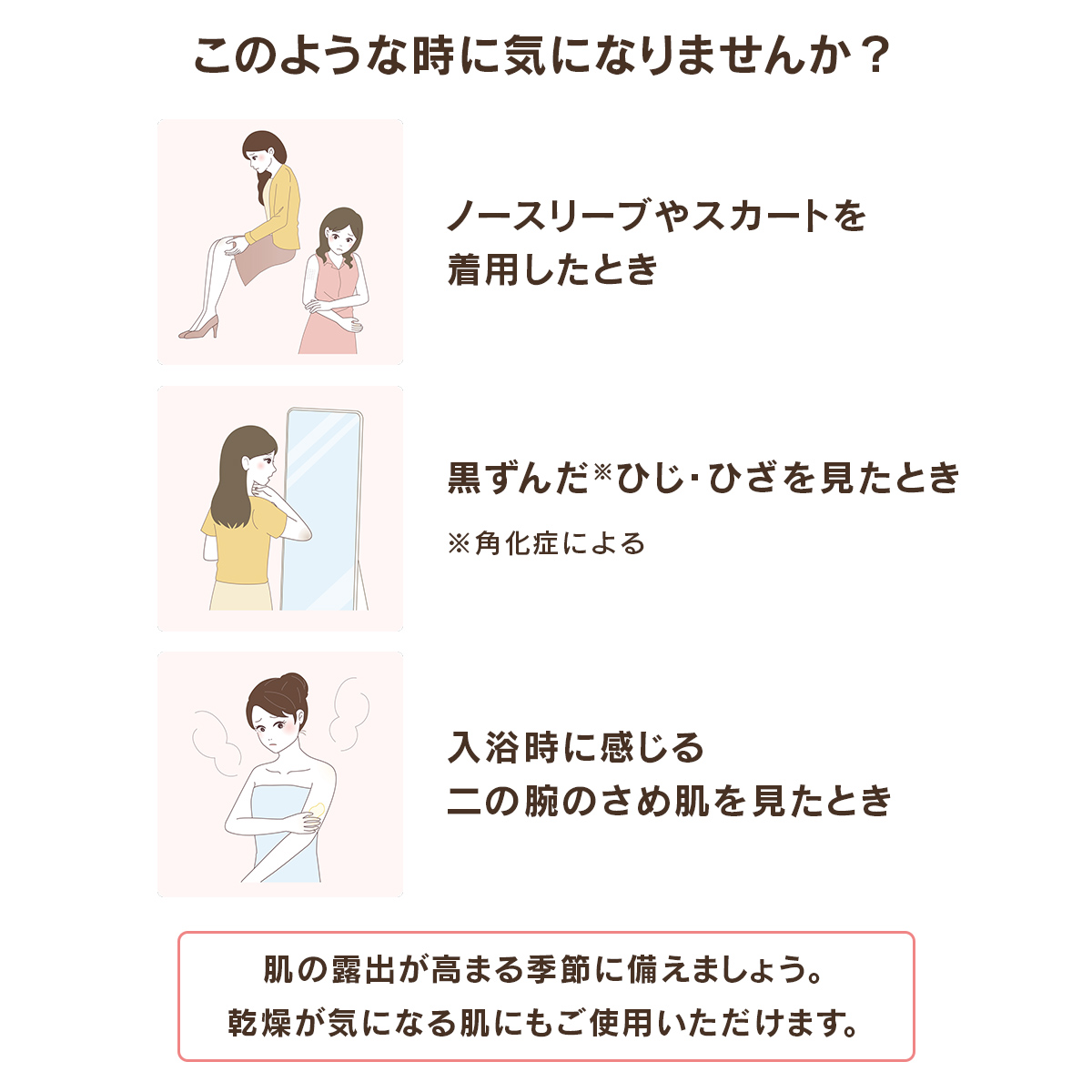 尿素20%に加え、抗炎症成分と血行促進成分を配合!血流を促進し、しっかり保湿することで、ひじ・ひざの黒ずみや二の腕のさめ肌を改善します。