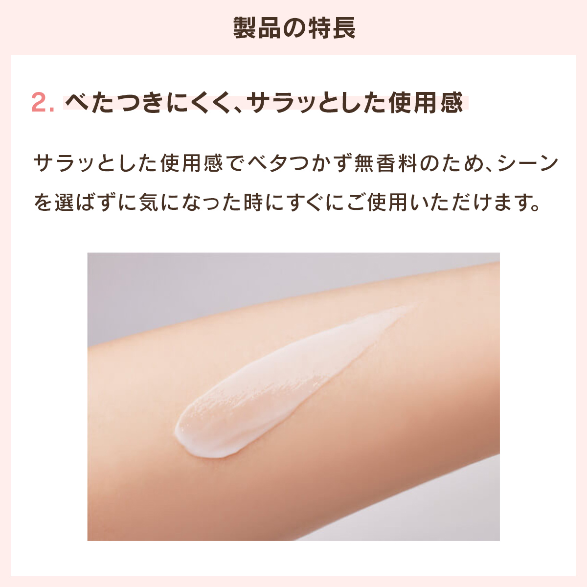 サラッとした使用感でベタつかず無香料のため、シーンを選ばずに気になった時にすぐにご使用いただけます。