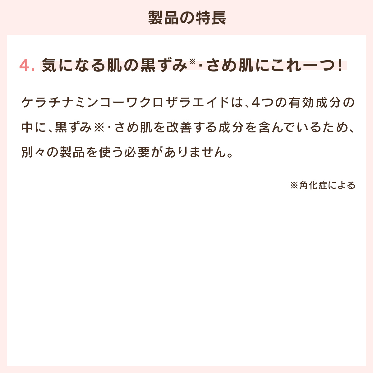 ケラチナミンコーワクロザラエイドは、4つの有効成分の中に、黒ずみ・さめ肌を改善する成分を含んでいるため、別々の製品を使う必要がありません。