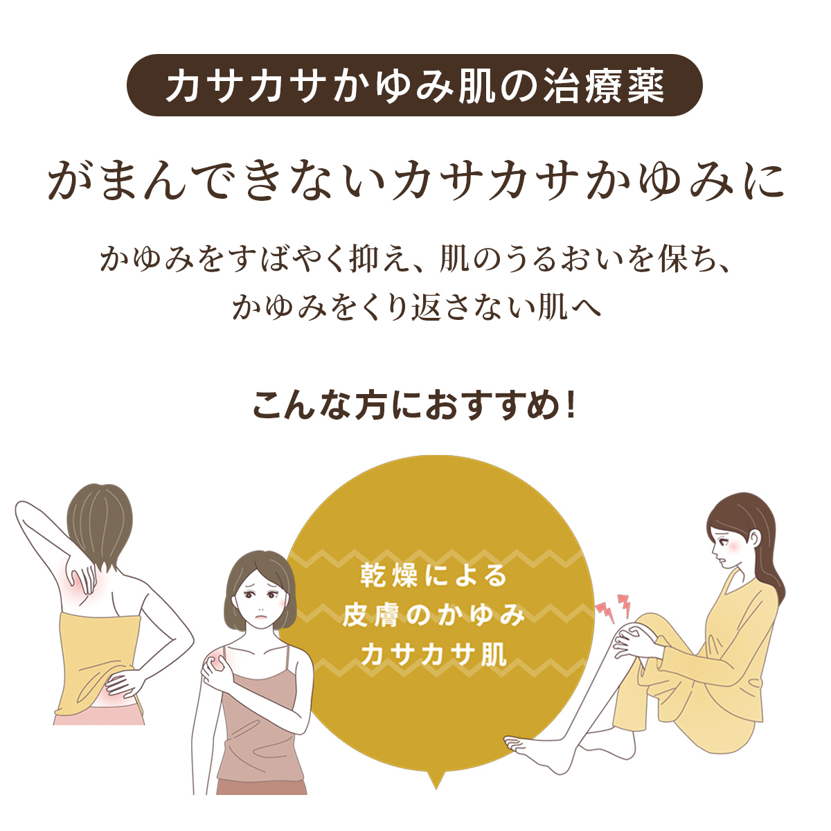 乾燥によるかゆみを抑えた上で、基剤成分が肌を保護することにより、かゆみをくり返さない肌へと改善していきます。ツライときにこそ、医薬品の力をお試しください。