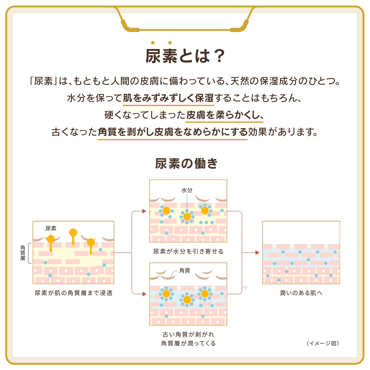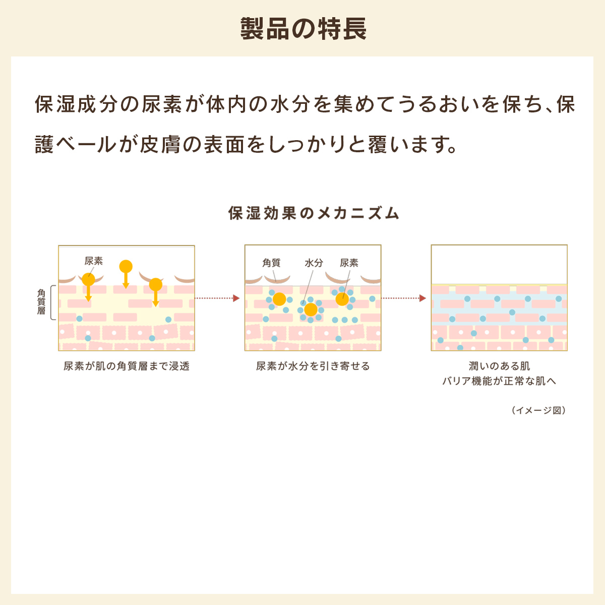 保湿成分の尿素が体内の水分を集めてうるおいを保ち、保護ベールが皮膚の表面をしっかりと覆います。