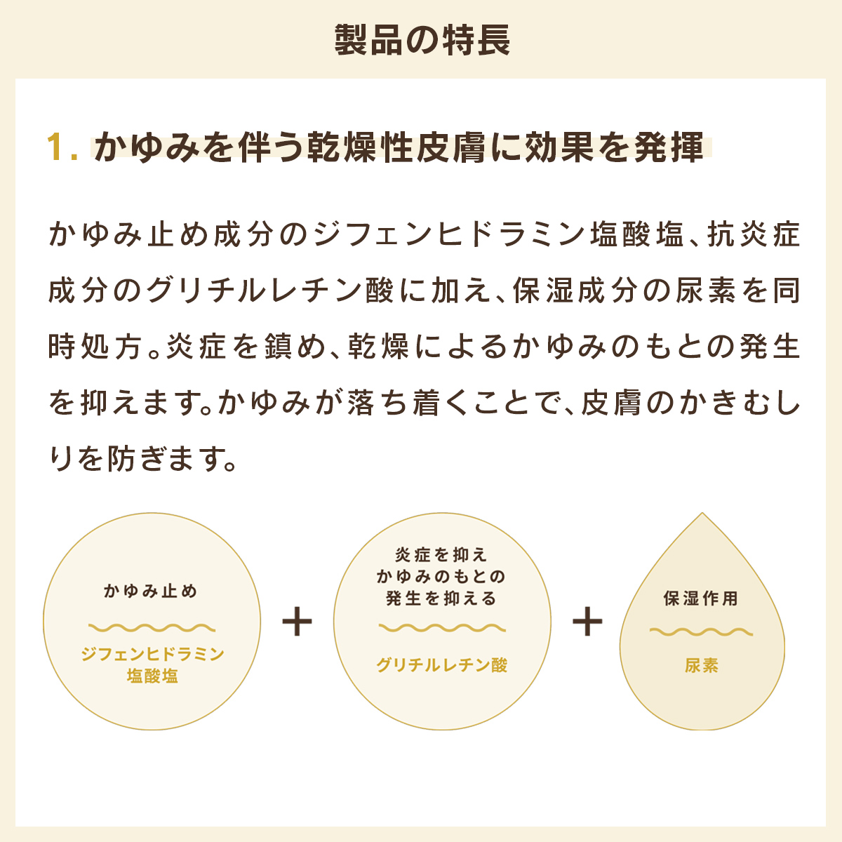 かゆみ止め成分のジフェンヒドラミン塩酸塩、抗炎症成分のグリチルレチン酸に加え、保湿成分の尿素を同時処方。炎症を鎮め、乾燥によるかゆみのもとの発生を抑えます。かゆみが落ち着くことで、皮膚のかきむしりを防ぎます。