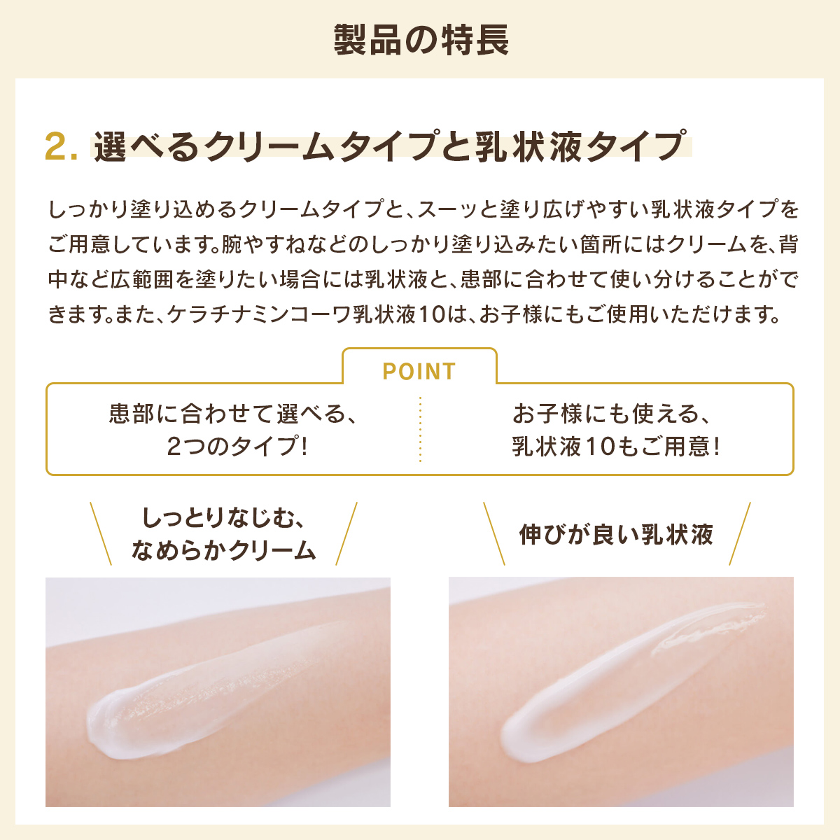 しっかり塗り込めるクリームタイプと、スーッと塗り広げやすい乳状液タイプをご用意しています。腕やすねなどのしっかり塗り込みたい箇所にはクリームを、背中など広範囲を塗りたい場合には乳状液と、患部に合わせて使い分けることができます。また、ケラチナミンコーワ乳状液10は、お子様にもご使用いただけます。