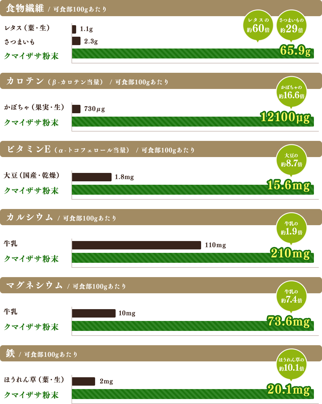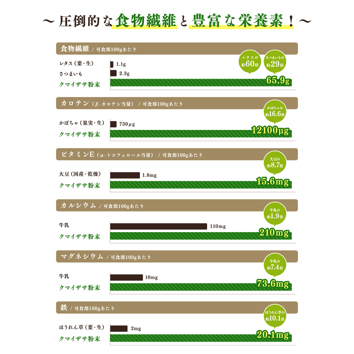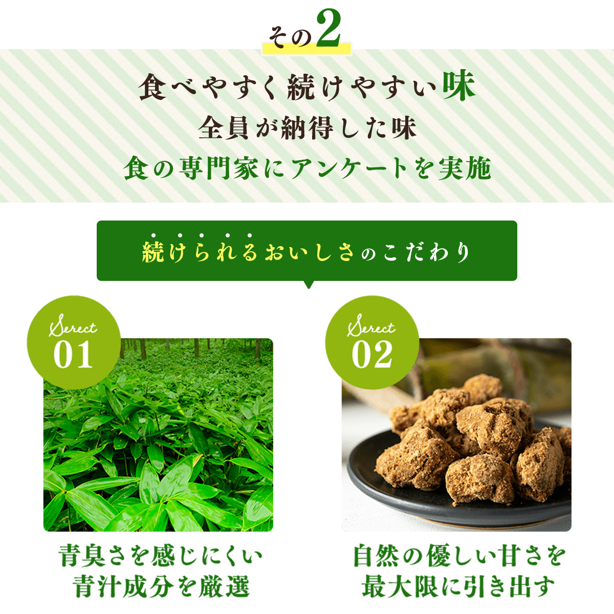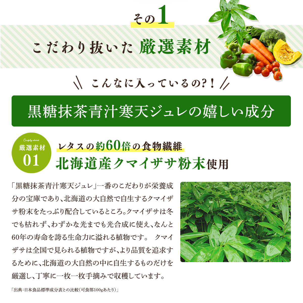 「黒糖抹茶青汁寒天ジュレ」一番のこだわりが栄養成分の宝庫であり、北海道の大自然で自生するクマイザサ粉末をたっぷり配合しているところ。クマイザサは冬でも枯れず、わずかな光までも光合成に使え、なんと60年の寿命を誇る生命力に溢れる植物です。 クマイザサは全国で見られる植物ですが、より品質を追求するために、北海道の大自然の中に自生するものだけを厳選し、丁寧に一枚一枚手摘みで収穫しています。