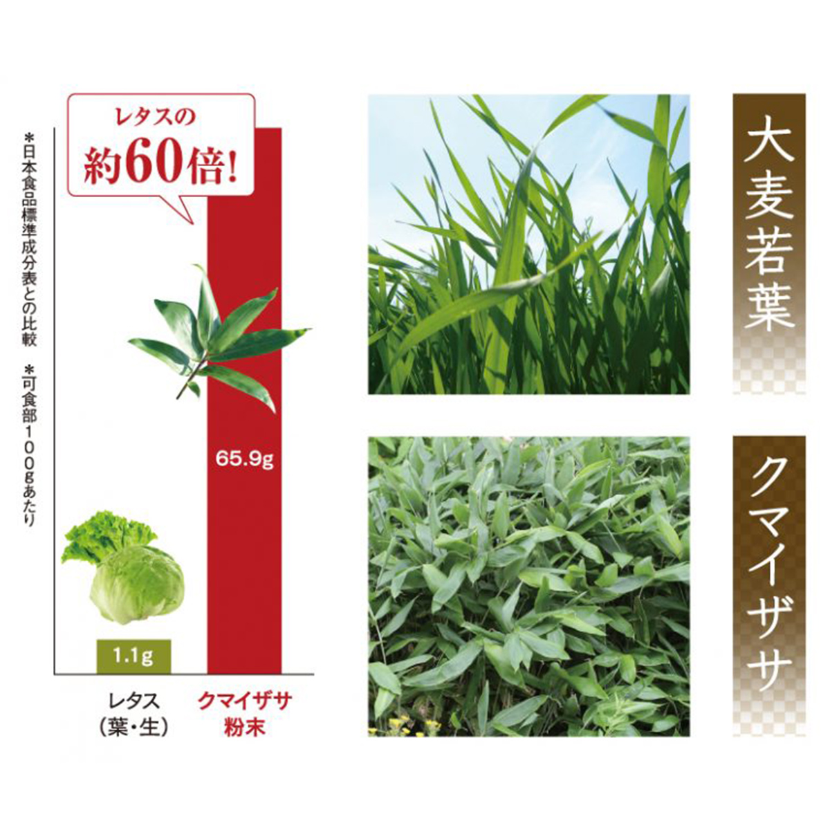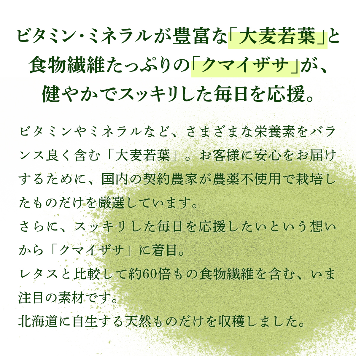 ビタミン・ミネラルが豊富な「大麦若葉」と食物繊維たっぷりの「クマイザサ」が、