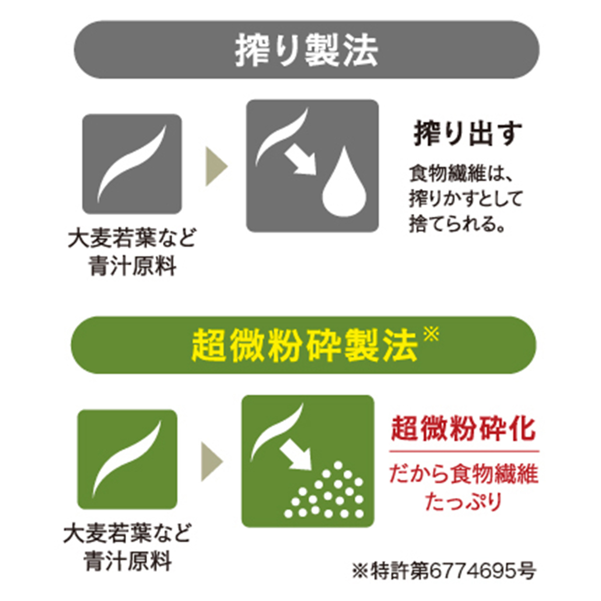 当社従来品の青汁で採用していた「搾り製法」とは異なり、収穫した素材を
