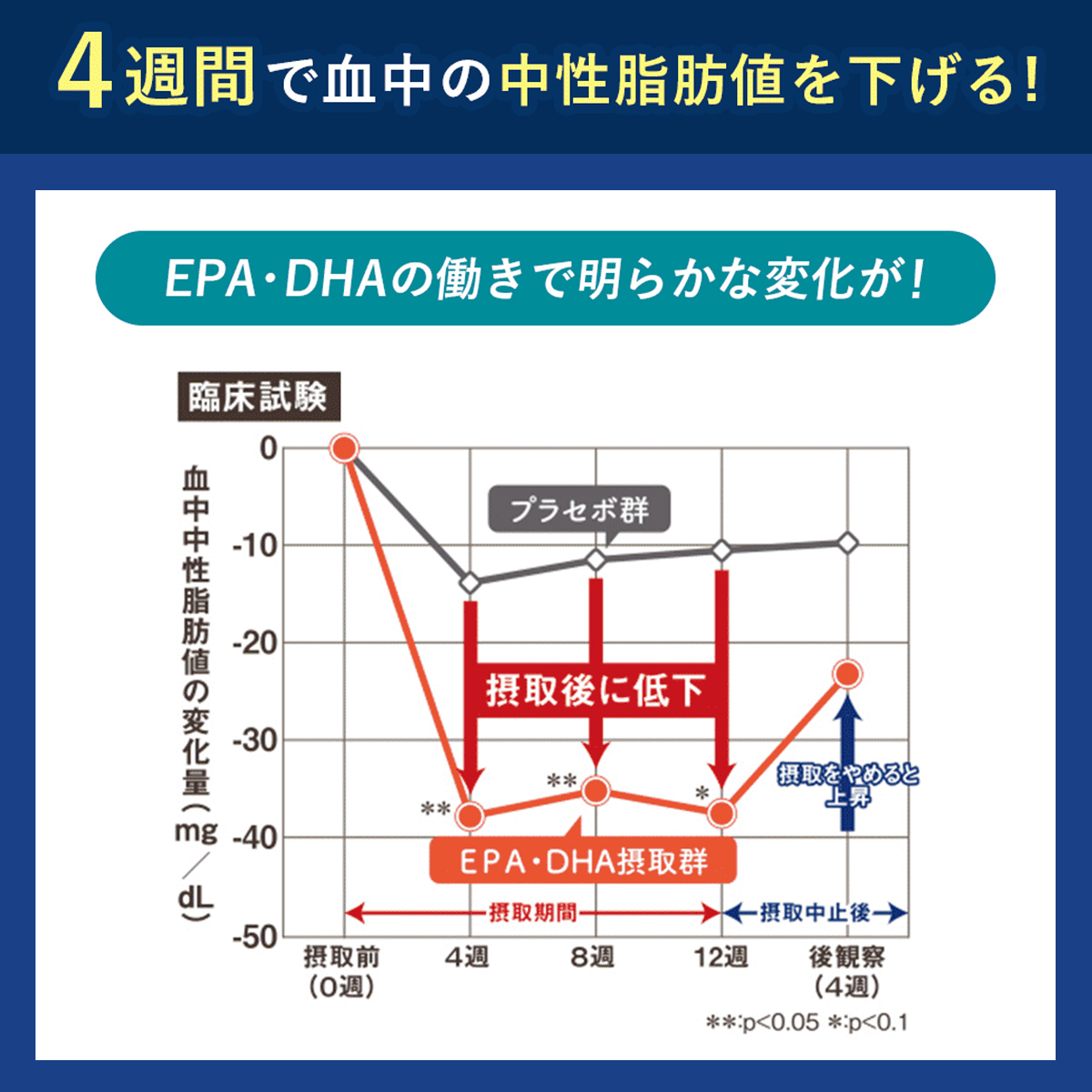 【届出表示】本品はEPA・DHAが含まれます。EPA・DHAには血中の中性脂肪値を低下させる機能が あることが報告されています。 本品は中性脂肪が気になる方に適しています。 届出番号:D337 |