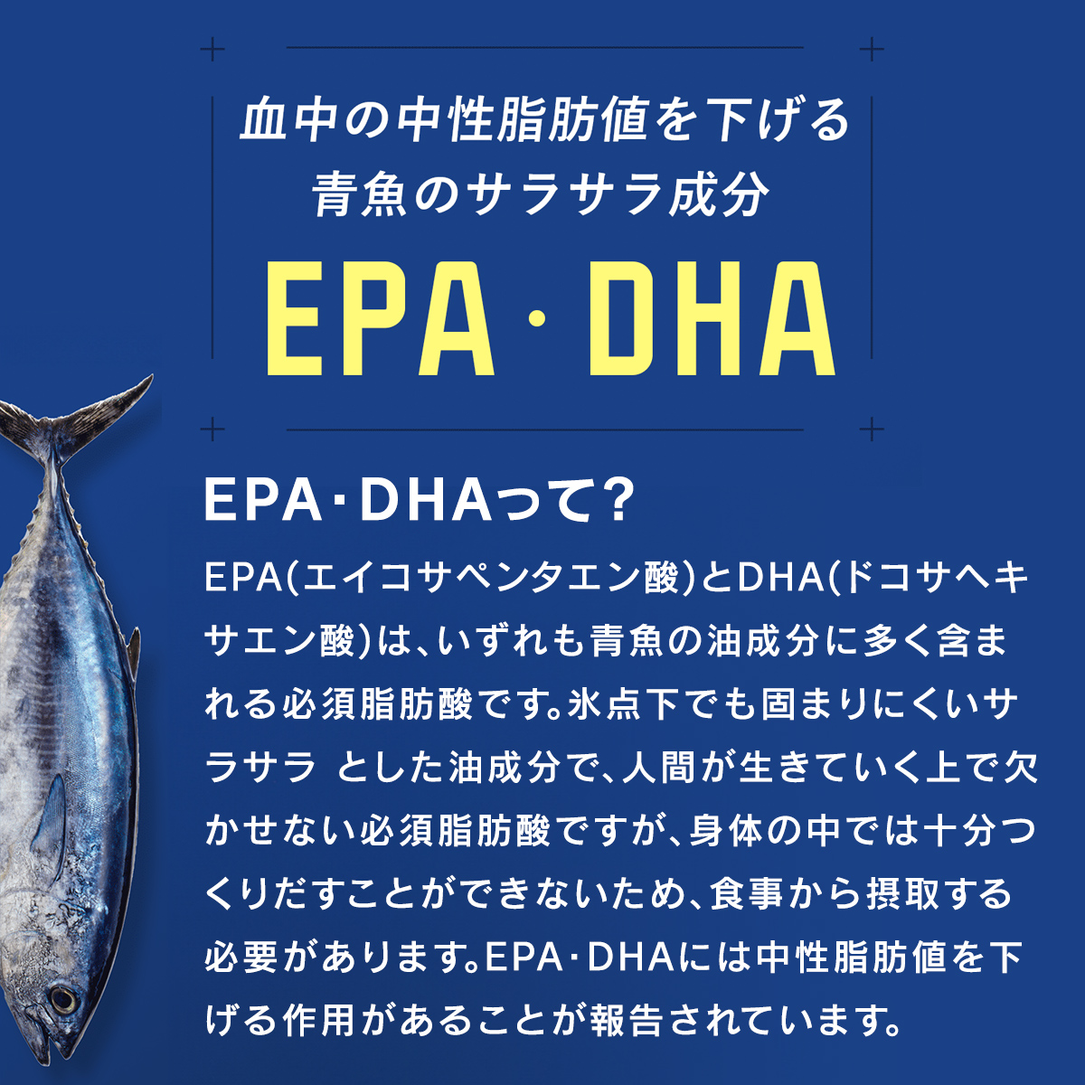 【届出表示】本品はEPA・DHAが含まれます。EPA・DHAには血中の中性脂肪値を低下させる機能が