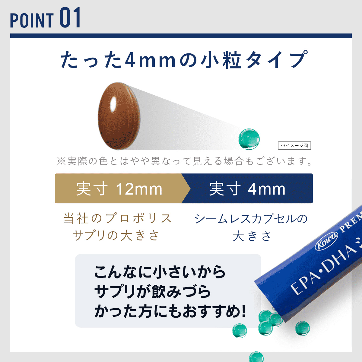 そこで、KOWAはEPA・DHAサプリを開発 飲みやすさを考え抜いた結果 シームレス×4mm小粒化