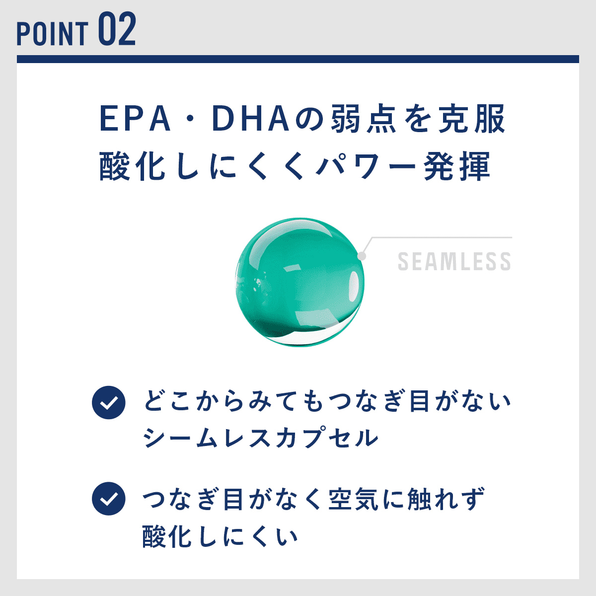 シームレスカプセル3つの特長 01:たった4mmの小粒タイプ  02:EPA・DHAの弱点を克服酸化しにくくパワー発揮 03:魚油の臭いもカット