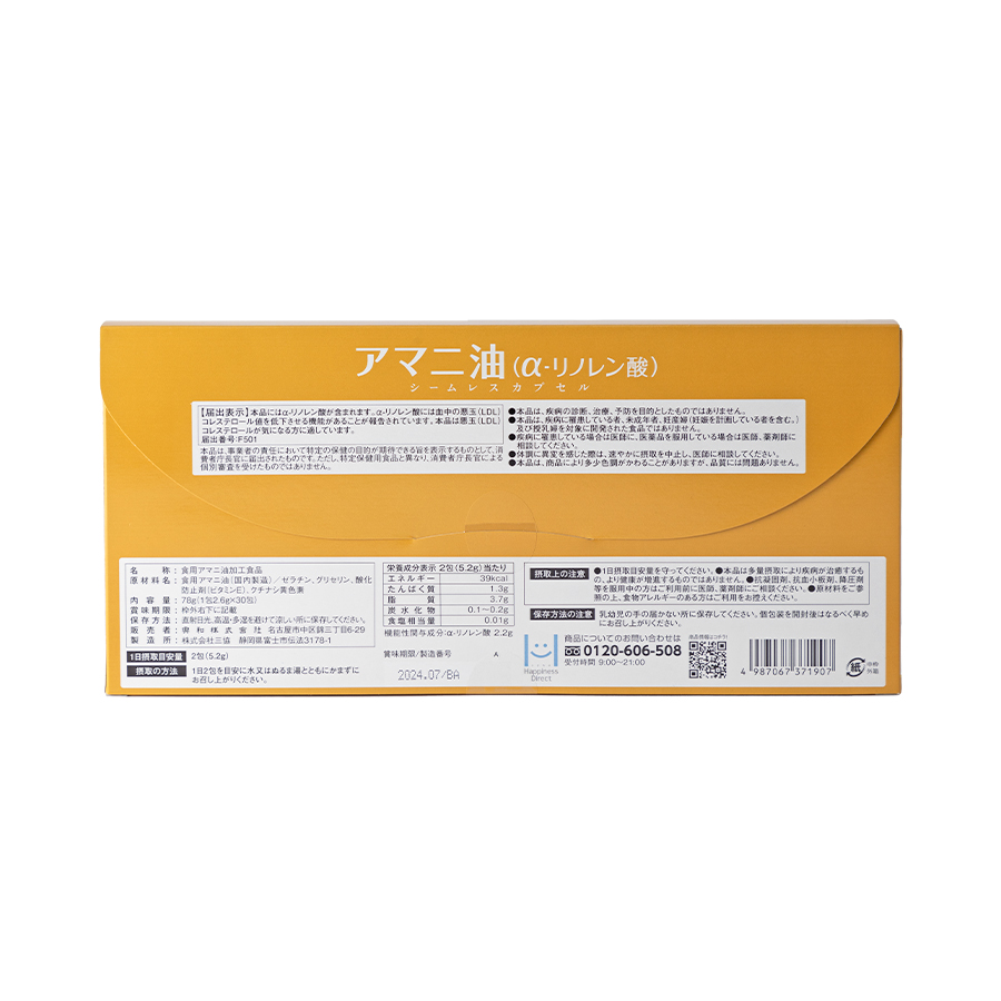 ■原材料名:食用アマニ油(国内製造)/ゼラチン、グリセリン、酸化防止剤(ビタミンE)、クチナシ黄色素