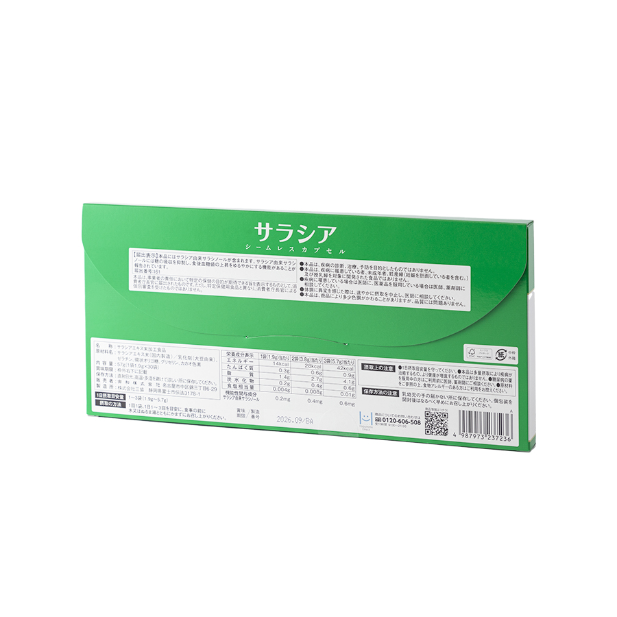 ■原材料名:サラシアエキス末(国内製造)/乳化剤(大豆由来)、ゼラチン、環状オリゴ糖、グリセリン、カカオ色素