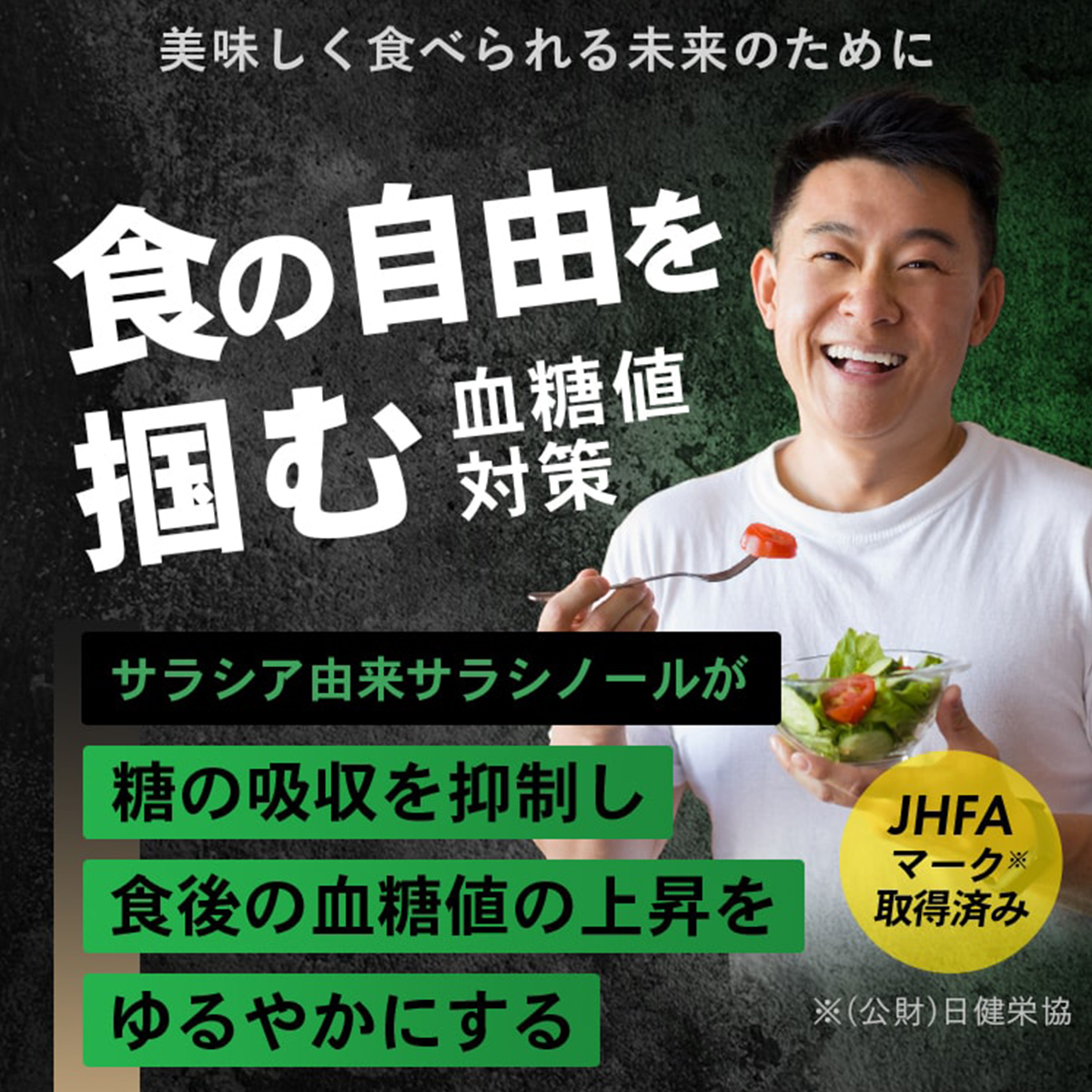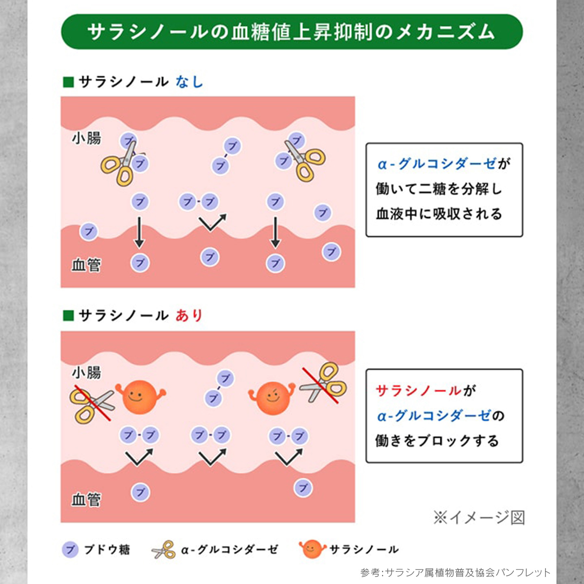 サラシア由来サラシノールには糖の吸収を抑制し、食後血糖値の上昇をゆるやかにする機能があることが報告されています。