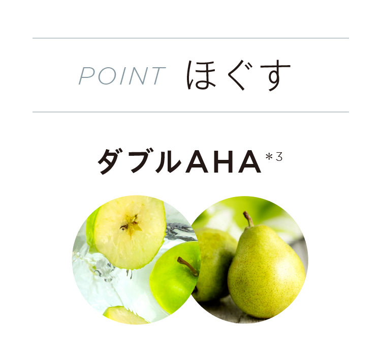 角質ケアのための2つのAHA(フルーツ酸)*3をダブル配合。