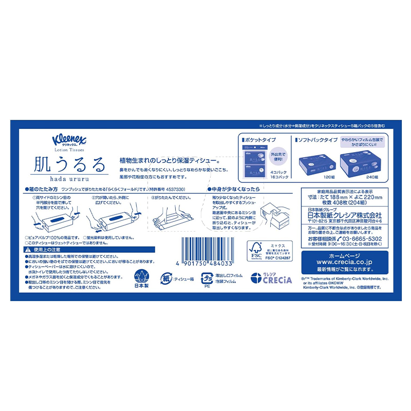 ●POINT1 しっとりとした潤い成分(水分+保湿成分)を5倍含み※紙厚も高く、ふっくらやわらかな肌触り。 ※しっとり成分(水分+保湿成分)をクリネックスティシュー5箱パックの5倍含む ●POINT2シートに保湿成分を均一に塗布し、しわを少なくすることで、よりなめらかですべすべした肌触り。 ●POINT3ティシューの破れやすい方向の強度を高め、やわらかいのに破れにくく、鼻をかんだ際も安心して使用できます。 ●POINT4フィルム包装のみなので、捨てる時ラクな「ソフトパック」