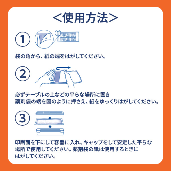 3. 印刷面を下にして容器に入れ、キャップをして安定した平らな場所で使用してください。薬剤袋の紙は使用するときにはがしてください。