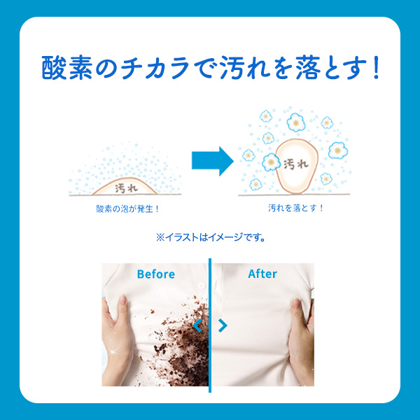 | 素材・成分 | 過酸化水素(酸素系))、界面活性剤(ポリオキシエチレンアルキルエーテル)、アルカリ剤(炭酸ナトリウム) |