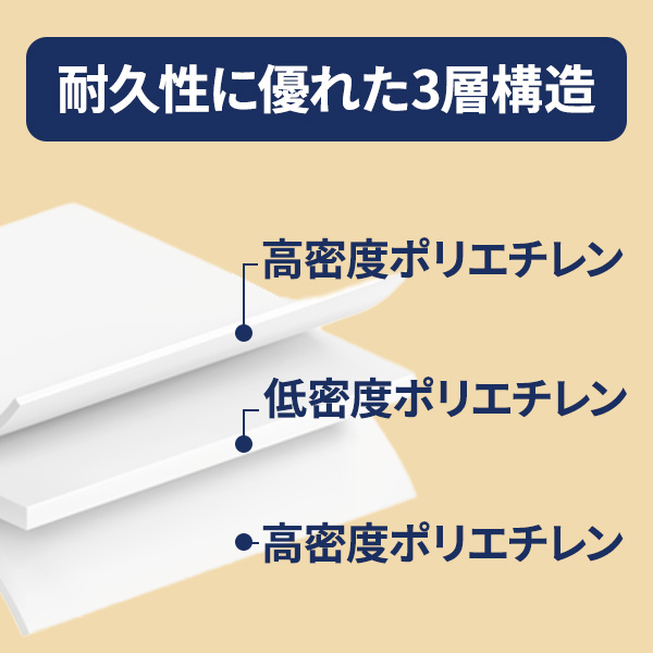 HDPEとLLDPEを組み合わせた3層構造で、通常より強度が大幅に向上。