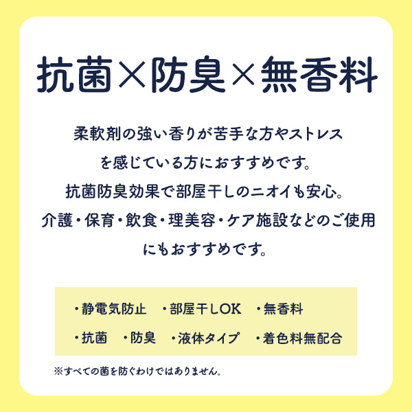 香りが苦手な方やニオイの強い柔軟剤にストレスを感じる方におすすめの柔軟剤です。