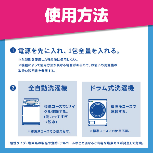 シュワッと溶けてすぐに効果を発揮する「洗たく槽クリーナー」は、カビや菌を徹底的に除去し、洗たく槽の裏側まできれいにします。