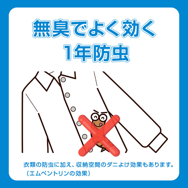 | 成分 | 防虫成分:エムペントリン(蒸散性ピレスロイド) 防カビ成分:イソチアゾリン系防カビ剤 |