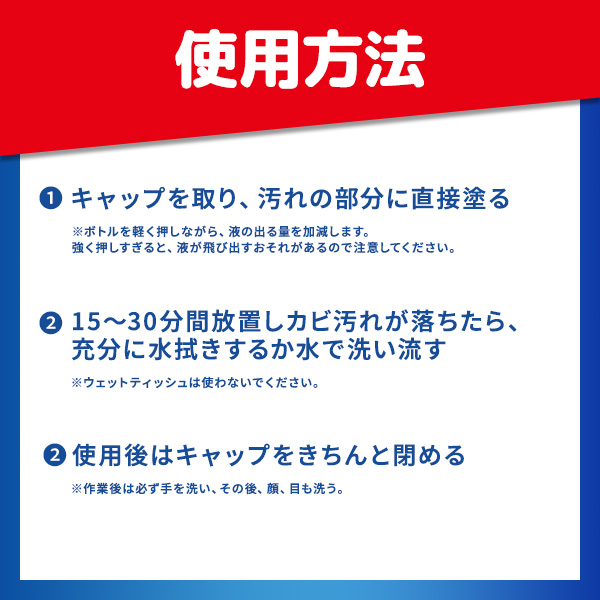 2. 必ず単独で使用する。酸性タイプの製品や食酢、アルコール、アンモニア等と混ぜると有害なガスが発生して危険。