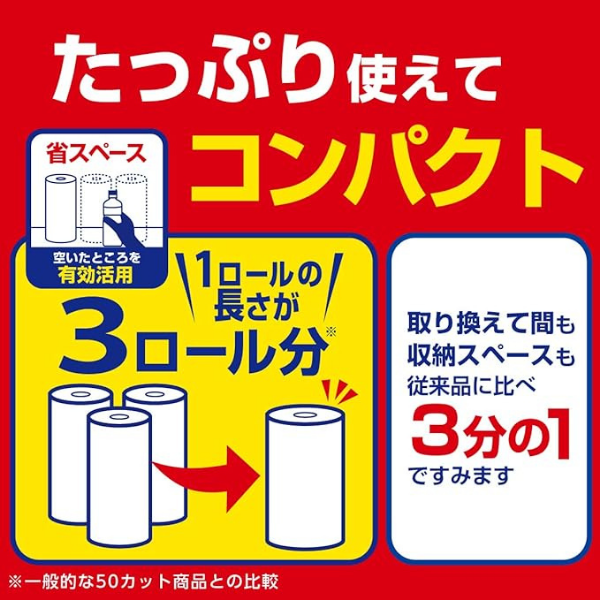 1ロールで一般的な50カット商品と比べ3倍の長さ(※)を実現し、コンパクトで収納スペースも軽減。