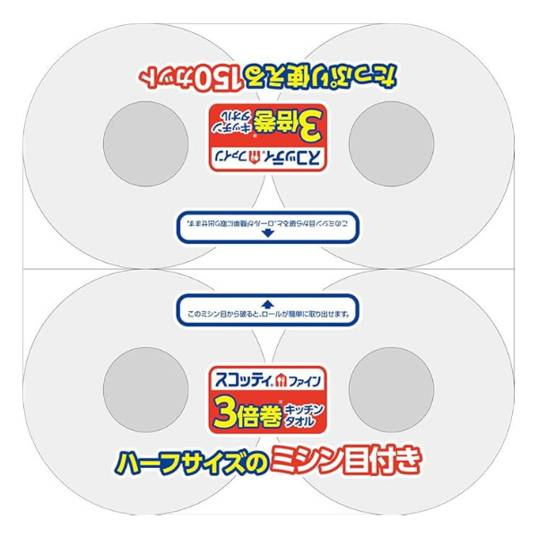 「スコッティファイン 3倍巻き キッチンタオル」は、用途に合わせて簡単に切り分けできるミシン目付きで便利!