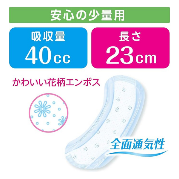 軽い尿モレも「ポイズ さらさら素肌 吸水ナプキン 安心の少量用 40cc」なら安心。