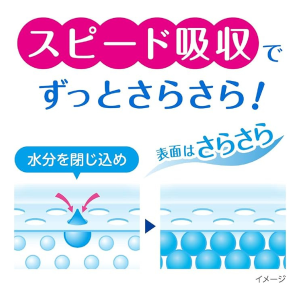 スピード吸収ポリマーで逆戻りを防止、ムレにくい全面通気性でお肌さらさら。